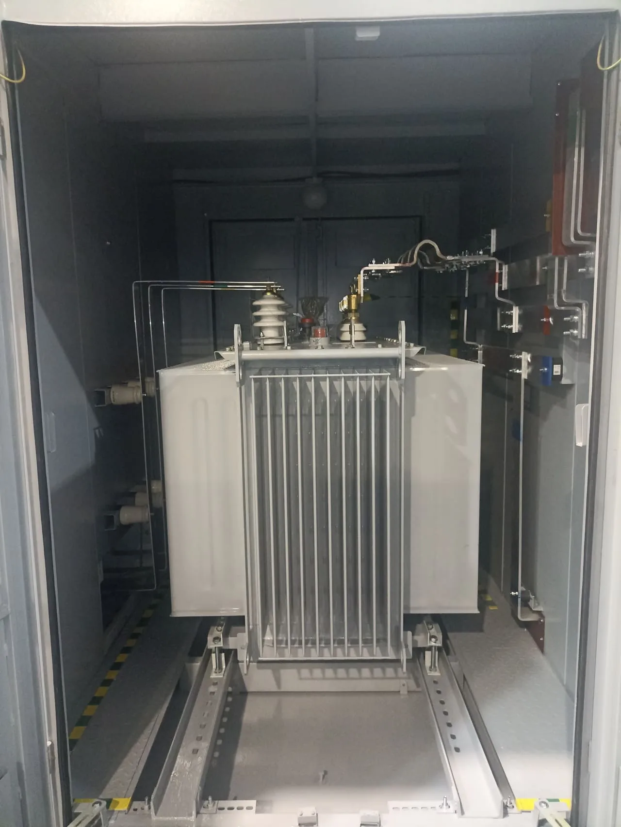 Для технологического присоединения в Новом Уренгое реализована и поставлена двухтрансформаторная подстанция мощностью 1000 кВА в утепленном исполнении с системой охранно-пожарной сигнализации и обогревом отсеков.